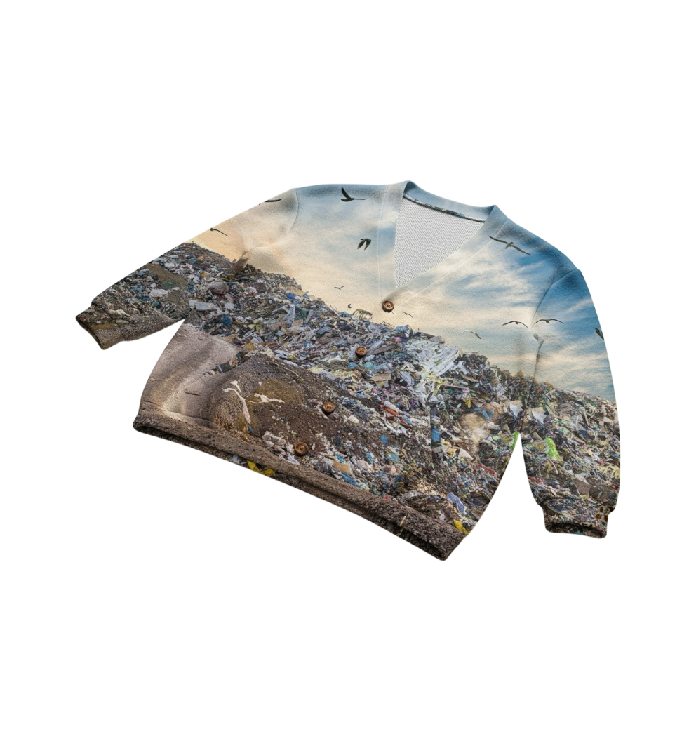 A classic redefined, the Landfill Cardigan Sweater merges timeless knitwear with a raw, thought-provoking edge. Designed with a textured Hacci fleece exterior and a soft fleece-lined interior, this cardigan offers both warmth and structure—perfect for the colder seasons. The V-neck button-up design adds a clean, effortless drape, making it easy to style up or down.